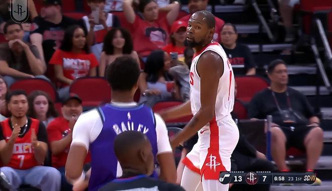 这场比赛是杜兰特火箭生涯的第一场比赛,37岁的老KD前两次出手都没进,第三个中投拿到首分,随后第四次出手又不中,首节8分钟,4中1+三分1中0,拿2分1篮板。
